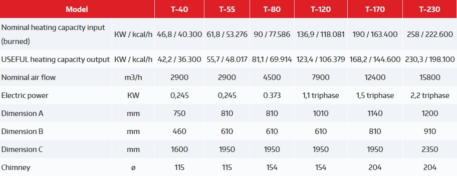 High efficiency heat exchanger. Combustion chamber made of AISI 310 heat resistant stainless steel, cylindrical, perfectly cooled in all of its points.