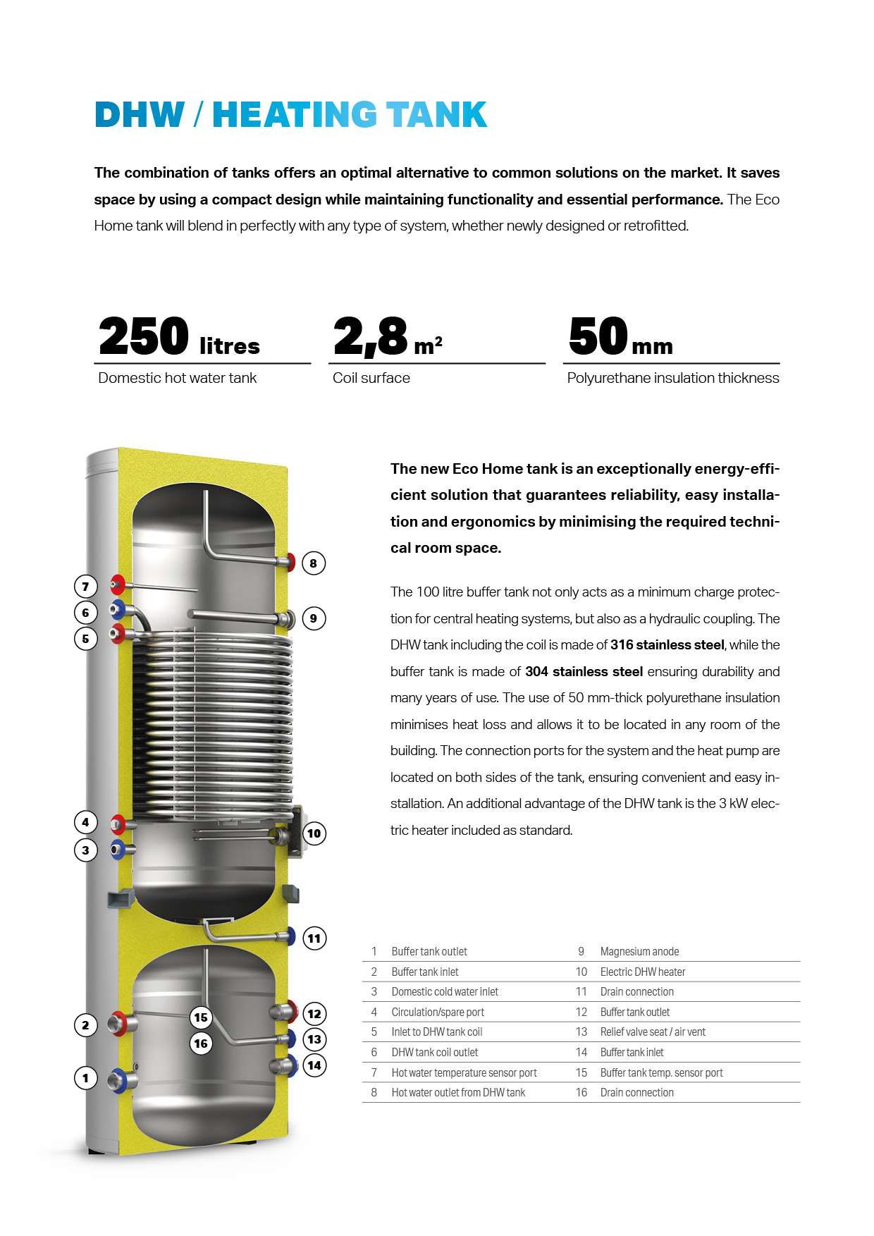 Kaks ühes: roostevaba tarbeveeboiler 250 l ja puhverpaak 100 l, boileri soojusvaheti 2,8 m2, Ø650 h-1870 mm, komplektis elektriküttekeha 3 kW